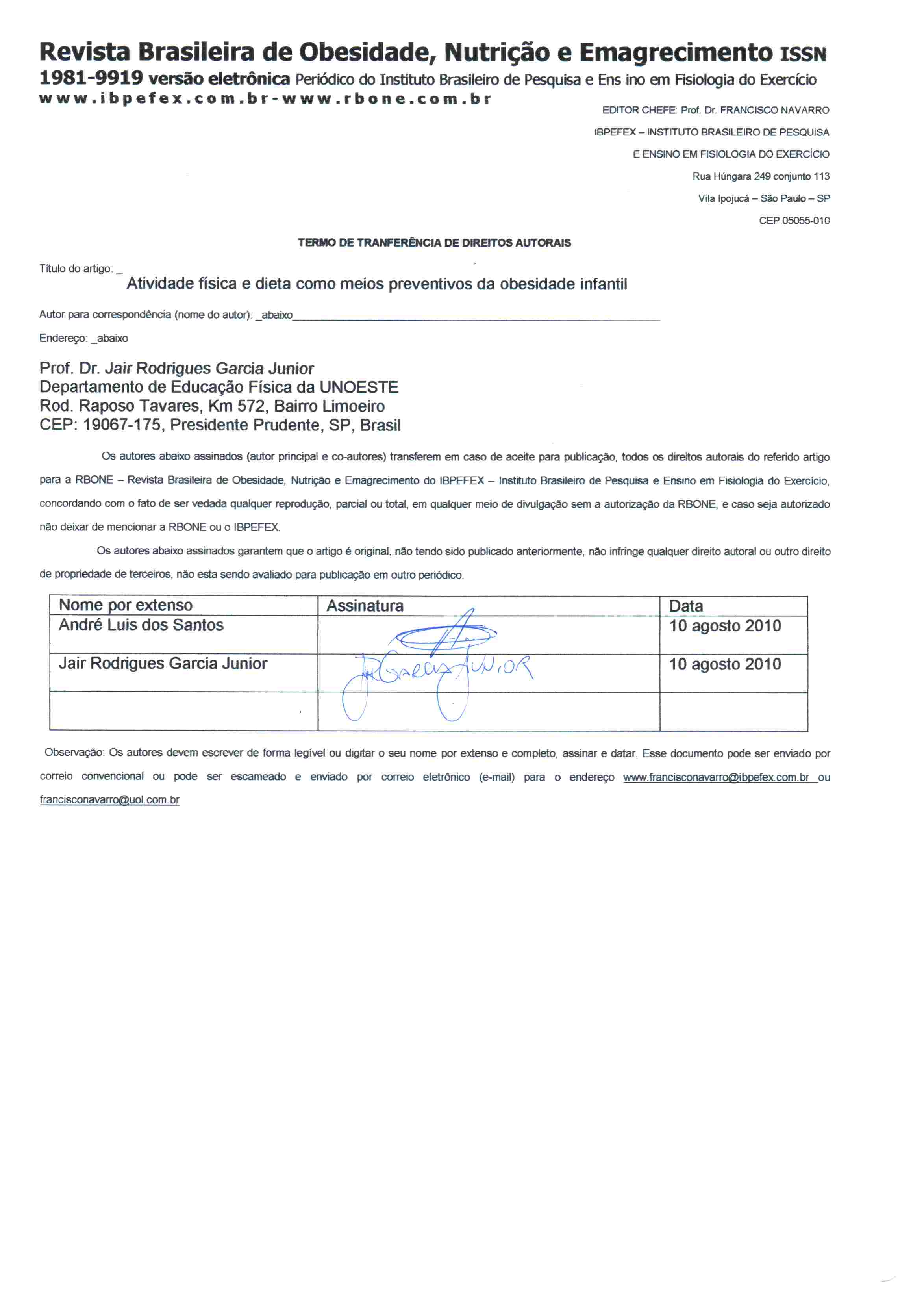 -Ronque, V.E.R.; Cyrino, E.S.; Dórea, V.R.; Santos Júnior, H.; Galdi, E.H.G.; Arruda, M. Prevalência de sobrepeso e obesidade em escolares de alto nível socioeconômico em Londrina, Paraná, Brasil. Revista de Nutrição. Vol. 18. 2005. p. 709-717.
